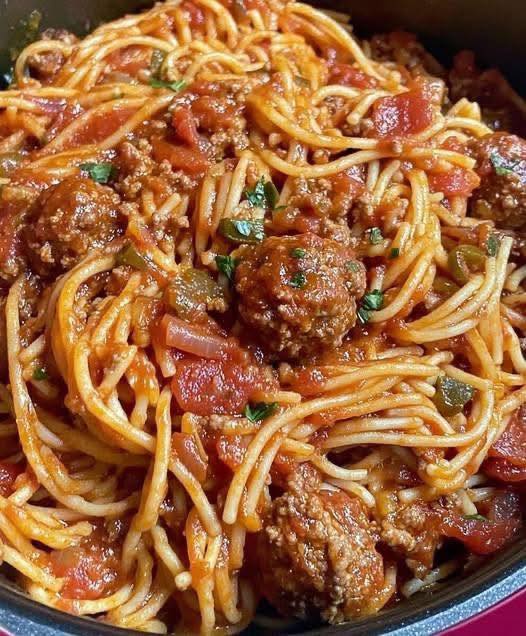 Spaghetti z klopsikami to ponadczasowe danie, które rozgrzewa i rozwesela stoły na całym świecie. To sycące danie składa się z delikatnych, soczystych klopsików duszonych w bogatym sosie pomidorowym, podawanych na idealnie ugotowanym makaronie spaghetti, często posypanych świeżymi ziołami i startym parmezanem. Zdjęcie doskonale oddaje istotę dania: nitki spaghetti al dente splecione w soczystym, gęstym, czerwonym sosie z widocznymi kawałkami pomidorów, cebuli i zielonych ziół, a także pulchne klopsiki – niektóre w całości, inne lekko połamane, by odsłonić ich aromatyczne wnętrze – wszystko podane na patelni, przywodząc na myśl aromat domowej, włosko-amerykańskiej uczty.