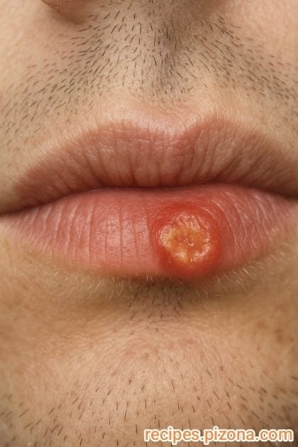 - Jak to wygląda/odczuwa się : Zaczyna się od mrowienia lub prania, a następnie tworzy małe pęcherze, które pękają, pokrywają się strupami i efektami strupy. Często na krawędzi wargi.